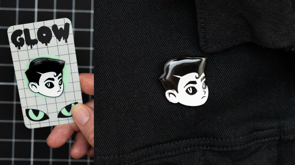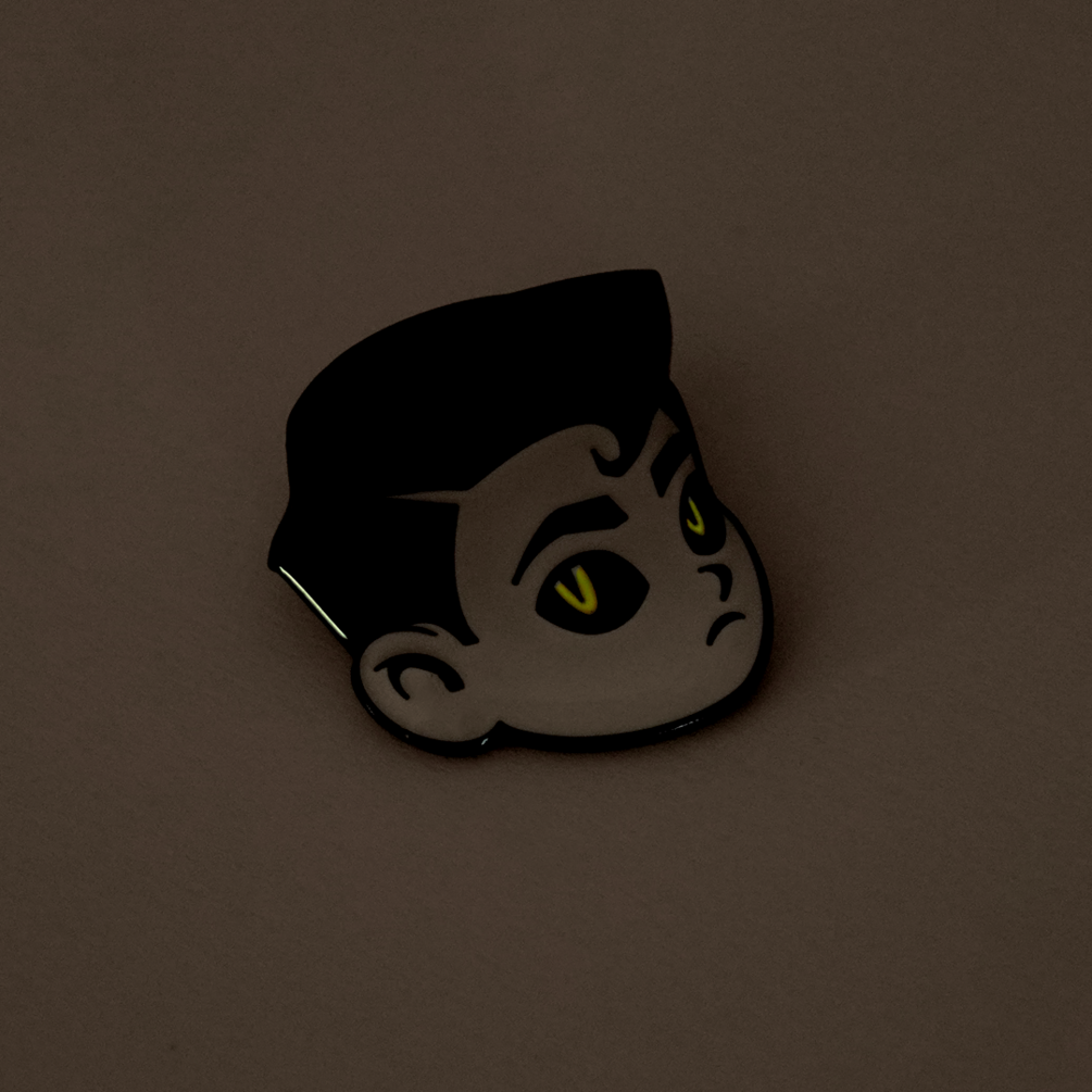 Product Info: Only the eyes glow on this pin, he's not radioactive.